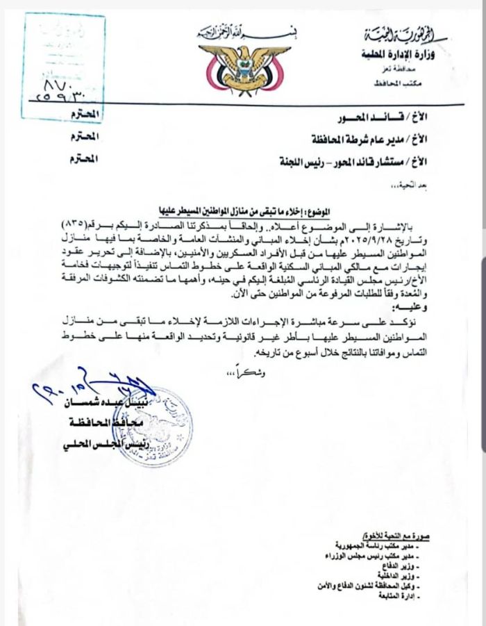 وبالتزامن، وجّه محافظ تعز كلاً من قائد المحور ومدير شرطة المحافظة ومستشار قائد المحور، رئيس اللجنة المكلفة، بسرعة إخلاء ما تبقى من المنازل المغتصبة، باعتبار استمرار الاستيلاء عليها انتهاكاً للقانون وحقوق المواطنين.