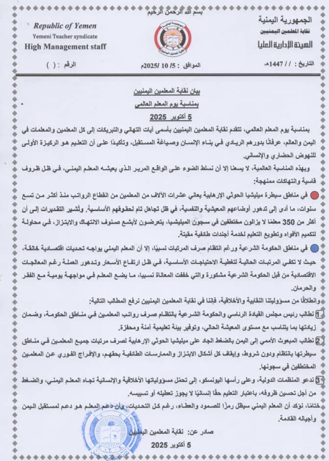 واختتمت النقابة بيانها بالتأكيد أن المعلم اليمني سيظل رمزًا للصمود والعطاء رغم كل الصعوبات، وأن دعم المعلم هو دعم لمستقبل اليمن وأجياله القادمة.