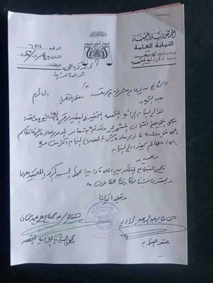 وبحسب المذكرة الصادرة بتاريخ 4 نوفمبر الجاري والموجهة إلى مدير أمن تعز، والممهورة بتوقيع وكيل النيابة الجزائية المتخصصة القاضي عبدالفتاح علي شمسان وعضو النيابة القاضي عبدالرحمن الجرادي، فقد جرى إشعار المذكورين بالحضور إلى النيابة أكثر من مرة دون استجابة، مما استدعى إصدار أمر القبض القهري بحقهما لإيداعهما السجن المركزي للتحقيق معهما وفقًا للقانون.